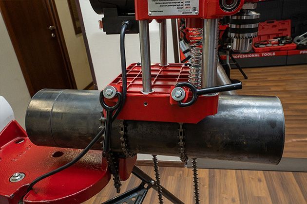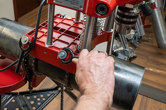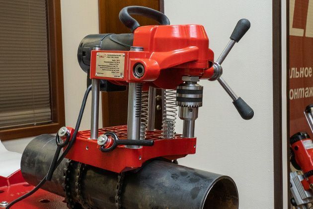 Прецизионное выполнение отверстий необходимого диаметра в определенных местах – важное условие для качественной установки фасонных деталей трубопроводов. При создании высокоточных отверстий в трубахэлектрические станкинадежно крепятся с помощью цепных держателей, позволяющих крепить аппараты в любых плоскостях. Фиксирование станков в строго горизонтальном положении по отношению к трубе происходит с помощью специального встроенного уровня.